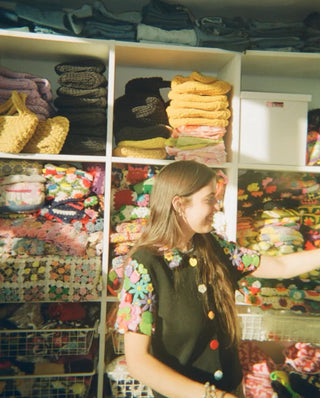 Reconstructing crochet blankets, quilt remnants, and pieces of embroidery into one-of-a-kind, wearable garments is an intentional effort to honor and elevate the materials and give them a second life outside of the home.